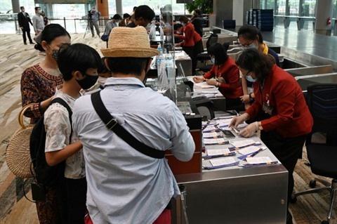 | Des convives procèdent à l'enregistrement avant d'embarquer pour un déjeuner dans un A380 à l'aéroport Changi de Singapour, le 24 octobre. |