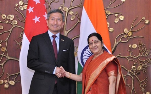 | Le ministre singapourien des Affaires étrangères Vivian Balakrishnan et son homologue indienne Sushma Swaraj, le 31 octobre à New Delhi. |