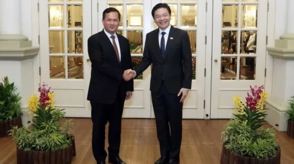 | Le Premier ministre singapourien Lawrence Wong (droite) et le Premier ministre cambodgien Hun Manet, le 18 juin. |