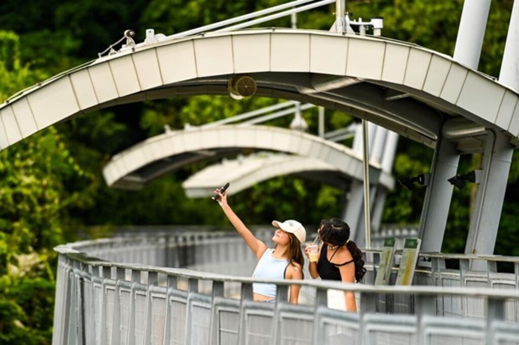 | Des gens prennent un selfie sur la passerelle de Fort Siloso sur l'île de Sentosa à Singapour le 16 décembre. |