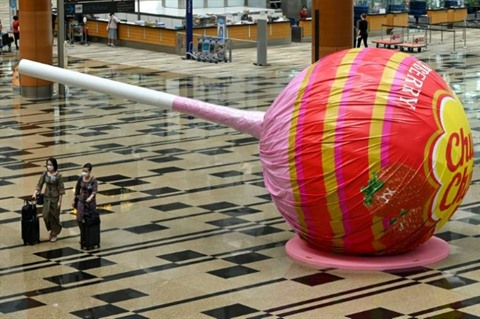 | Deux hôtesses de l'air de Singapore Airlines passent à côté d'une sucette géante à l'aéroport international de Changi à Singapour le 1er avril. |