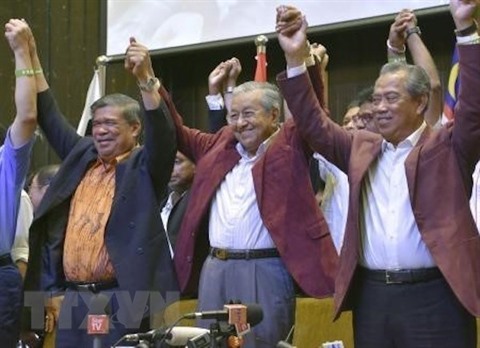 | Le Premier ministre malaisien, Mahathir Mohamad (centre) célèbre sa victoire, le 10 mai à Kuala Lumpur. |