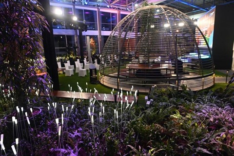 | Vue générale du patio du Connect@Changi, présenté comme le premier hôtel et centre de conférences sécurisé contre le COVID-19, le 18 février à Singapour. |