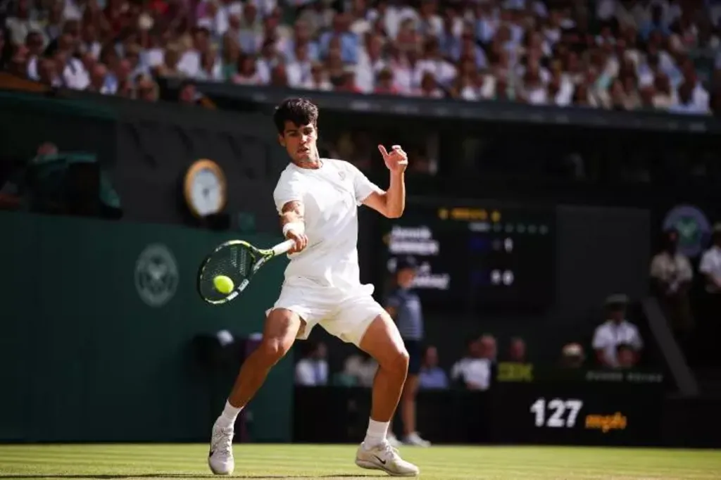| Le N°2 mondial Carlos Alcaraz en finale de Wimbledon contre le N°1 Jannik Sinner le 13 juillet à Londres. |