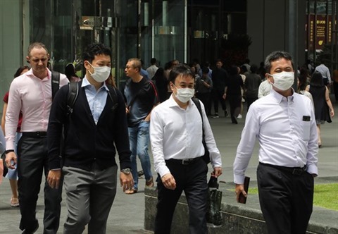 | Des Singapouriens portent des masques de protection pour la lutte contre le nouveau coronavirus. |