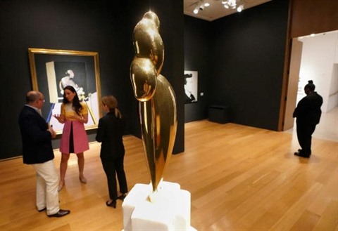 | Une sculpture de Brancusi, "La jeune fille sophistiquée" (Portrait de Nancy Cunard), présentée le 3 mai à New York avant sa mise aux enchères chez Christie's. |