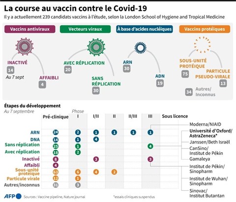 Trouver un vaccin efficace et sûr est considéré comme la meilleure manière de mettre un terme à la pandémie. Mais on ne sait pas quand cela arrivera, malgré de nombreux effets d'annonce dans une compétition planétaire aux enjeux financiers énormes. Dans son dernier point daté de mercredi 9 septembre, l'OMS recense 35 "candidats vaccins" évalués dans des essais cliniques sur l'homme à travers le monde.