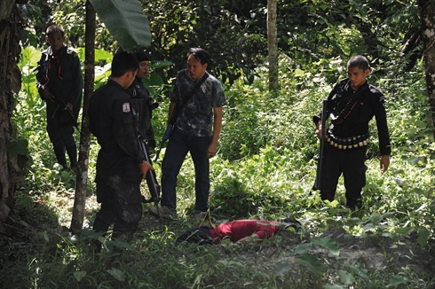 | Des policiers thaïlandais inspectent les lieux environnant le cadavre d’un insurgé séparatiste suspecté, le 30 avril dans la province thaïlandaise de Narathiwat (Sud) |