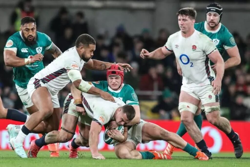 | Le troisième ligne anglais Ben Earl plaqué durant le match du tournoi des Six nations en Irlande, le 1er février. |