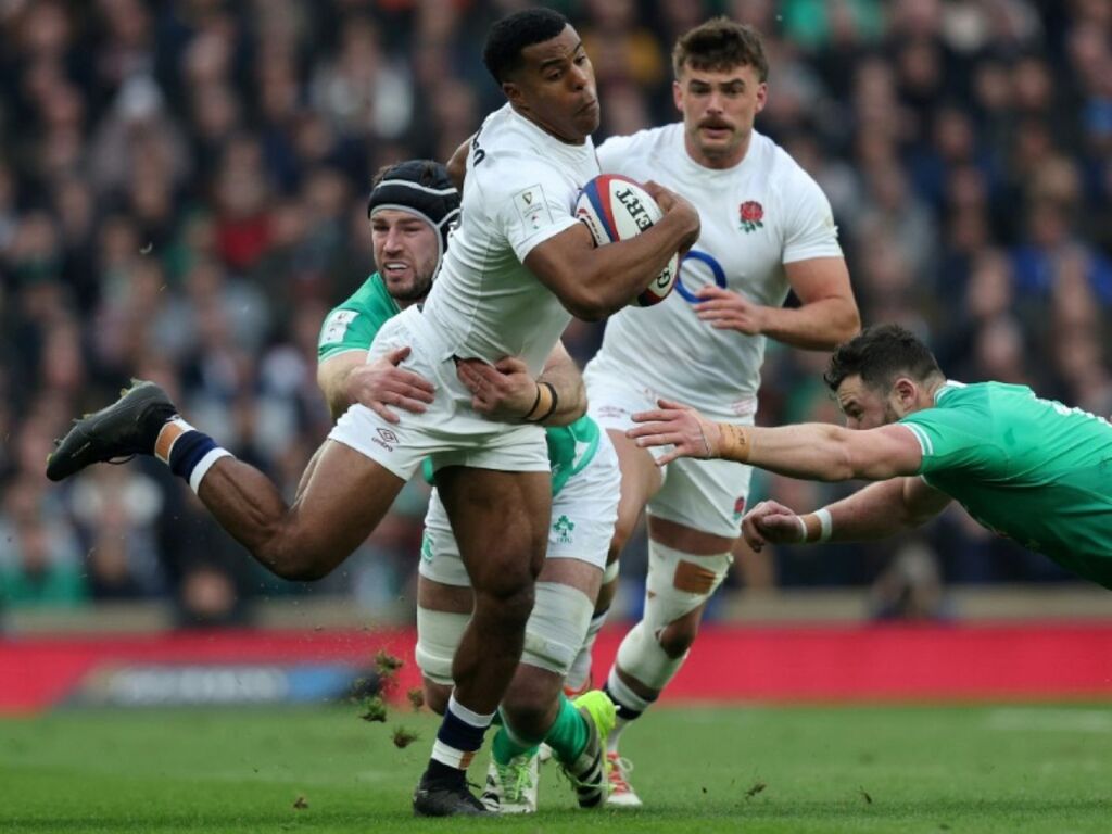 | L'ailier anglais Immanuel Feyi-Waboso (centre) lors de la victoire du XV de la Rose face à l'Irlande (23-22), le 9 mars à Twickenham. |