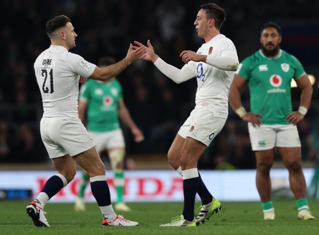 | Les demi de mêlée anglais Danny Care (gauche) et Alex Mitchell lors de la victoire du XV de la Rose face à l'Irlande (23-22), le 9 mars à Twickenham. |