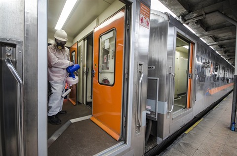 | Désinfection à l'intérieur d'un train à Bandung, dans l'Ouest de l'île de Java, en Indonésie. |