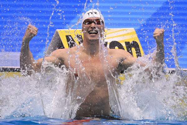 | Le Français Maxime Grousset lors de la finale du relais 4x100m quatre nages dimanche, pour la dernière journée des Mondiaux de Fukuoka, au Japon. |
