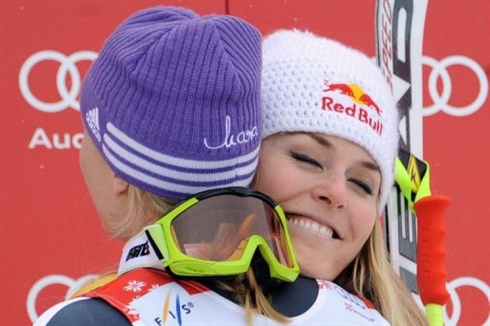 | Lindsey Vonn et Höfl-Riesch, victoireuse de la descente de Rosa Khutor, en Russie, le 18 février. |