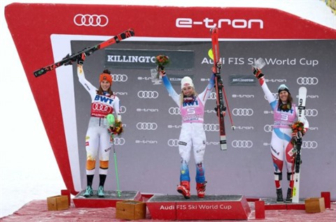 | Le podium du slalom de Killington (Vermont), dominé par Mikaela Shiffrin devant Petra Vlhova (gauche) et Wendy Holdener, le 28 novembre. |