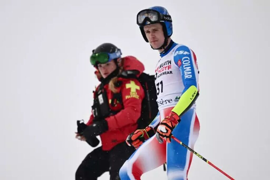 | Le Français Clément Noël après sa chute lors du slalom géant de Val d'Isère, le 14 décembre 2024. |