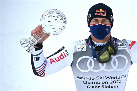 | Le Français Alexis Pinturault avec le Gros globe de cristal récompensant le meilleur skieur de la saison le 20 mars à Lenzerheide (Autriche). |