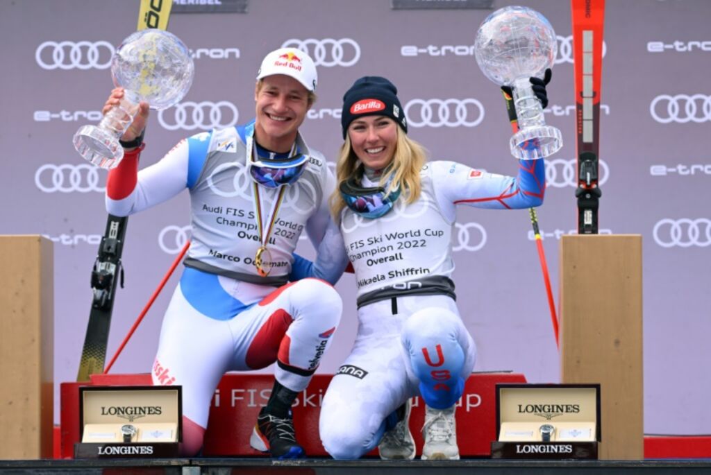 | Les vainqueurs du Globe de cristal de la Coupe du monde de ski alpin, le Suisse Marco Odermatt et l'Américaine Mikaela Shiffrin, le 20 mars à Méribel, dans les Alpes françaises. |