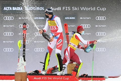 | Le Suisse Ramon Zenhäusern, vainqueur, et son dauphin autrichien Manuel Feller sur les deux premières marches du slalom d'Alta Badia, le 21 décembre. |
