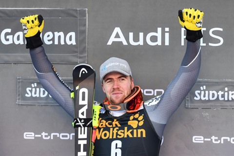 | Le Norégien Aleksander Aamodt Kilde bras levés sur le podium après avoir remporté la descente de Val Gardena, le 15 décembre. |