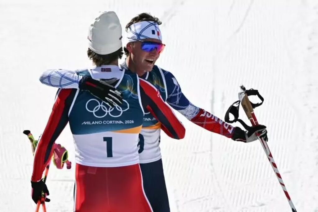 | Le fondeur français Mathis Desloges (droite), médaillé d'argent du skiathlon derrière le Norvégien Johannes Klaebo lors des JO de Milan Cortina, le 8 février. |