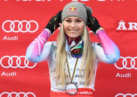 | L'Américaine Lindsey Vonn pose sur le podium après sa 2e place lors de la descente d'Åre en Suède, le 14 mars. |