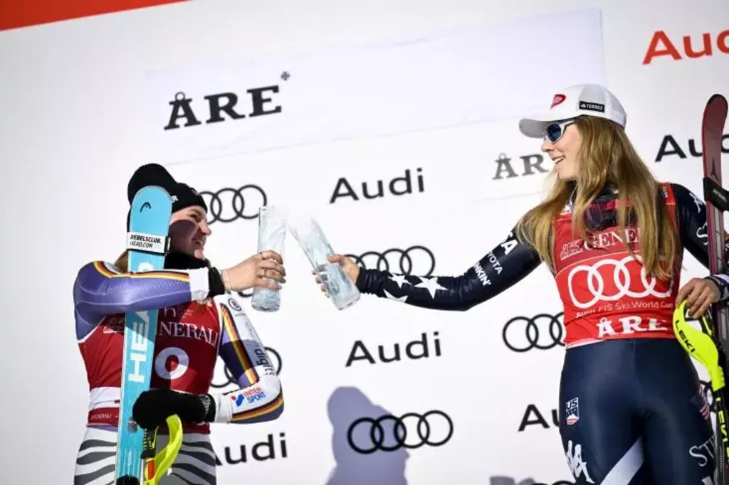 | Emma Aicher (gauche) et Mikaela Shiffrin sur le podium du slalom d'Are remporté par l'Américaine le 15 mars. |