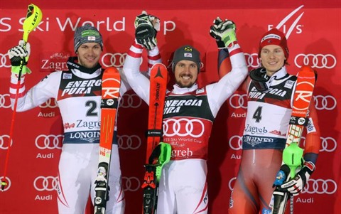 | Le podium du slalom de Zagreb, l'Autrichien Michael Matt (gauche, 2e), l'Autrichien Marcel Hirscher (vainqueur, centre) et le Norvégien Henrik Kristoffersen (3e, droite), le 4 janvier. |