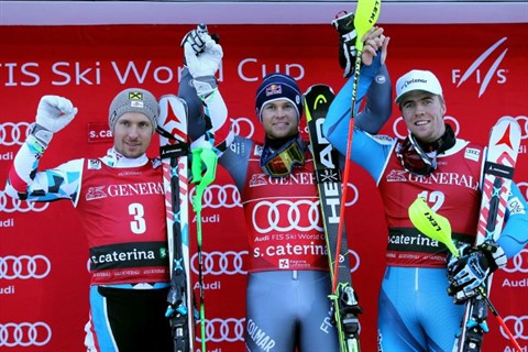 | Le podium du combiné de Santa Caterina dominé par Alexis Pinturault (centre), devant Marcel Hirscher (gauche) et Aleksander Aamodt Kilde, le 29 décembre |