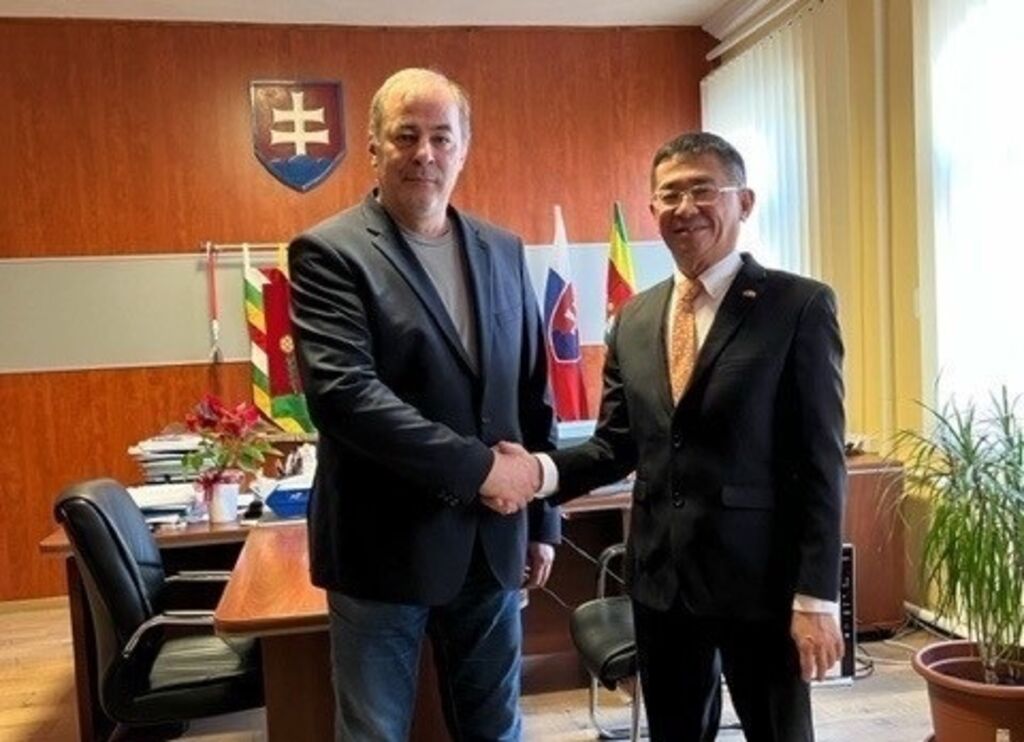 | L'ambassadeur du Vietnam en Slovaquie, Nguyên Tuân (droite), le gouverneur de Horné Saliby, Pavol Dobossy. |