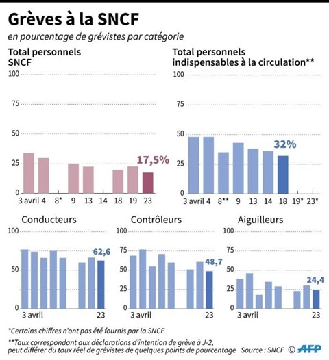 Le taux de grévistes s'élevait à 17,45% lundi 23 avril en milieu de matinée, a indiqué le groupe ferroviaire. Il s'agit du taux le plus bas communiqué depuis le début du mouvement, début avril. Cependant, la mobilisation des agents indispensables à la circulation des trains reste élevée, quoiqu'en baisse: 62,6% des conducteurs, 48,7% des contrôleurs et 24,4% des aiguilleurs.