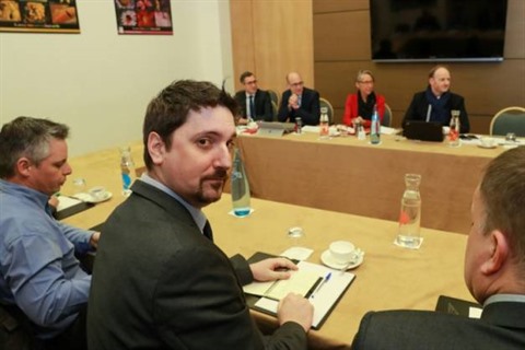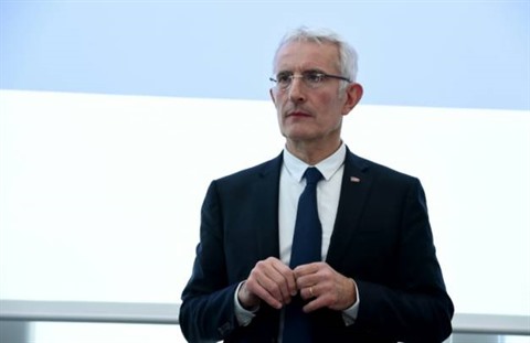 | Laurent Brun, secrétaire général de la CGT-Cheminots, lors d'une réunion avec la ministre des Transports, Elisabeth Borne, à Paris, le 19 février. |