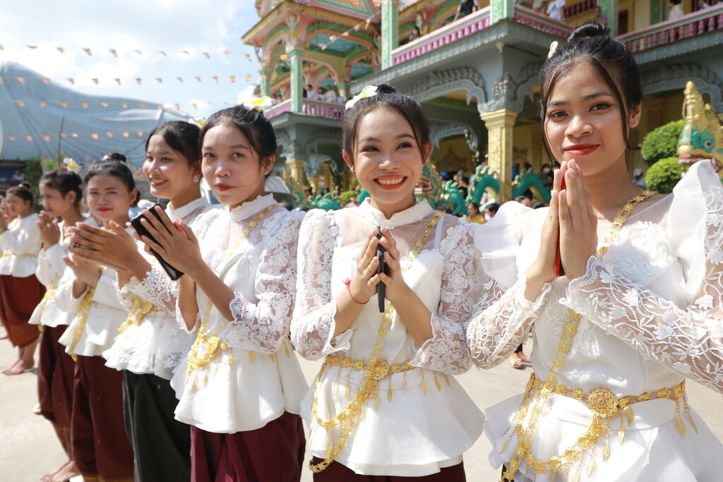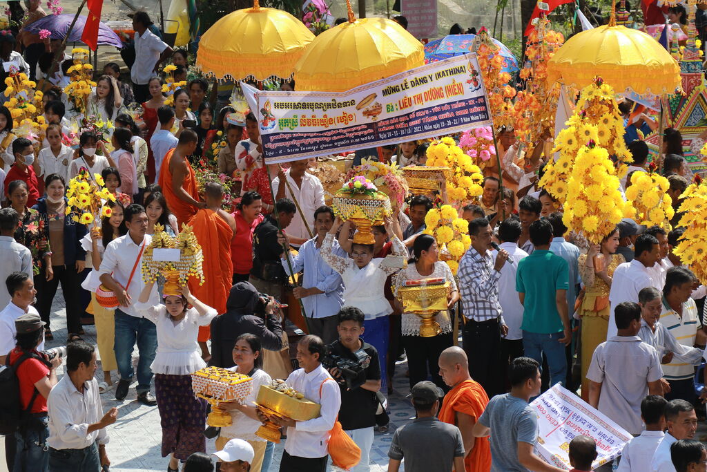 Se tenant habituellement en octobre-novembre du calendrier solaire, la cérémonie Katina des Khmers est l'événement qui rassemble tous les membres de la famille au temple, pour effectuer les offrandes de tuniques aux bonzes, ainsi que pour remercier Bouddha et l'aide apportee par les Êtres Suprêmes. En plus d'offrir ces tuniques aux bonzes, de nos jours les Khmers leur donnent également d'autres objets pratiques tels que des couvertures, des moustiquaires, des ustensiles de cuisine, des armoires ou de l’argent. Avec les Khmers, les gens d’origine chinoise et les Kinh profitent également de cette occasion pour s'inviter au temple et participer à la cérémonie d'offrandes des tuniques, priant pour la paix familiale.