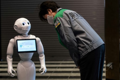 | Le robot "Pepper" le 1er mai 2020 à Tokyo avec la gouverneure du département de TokyoYuriko Koike. |