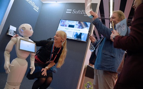| Le robot "Pepper" élaboré par SoftBank Robotics lors du Mobile World Congress de Barcelone, le 27 février. |