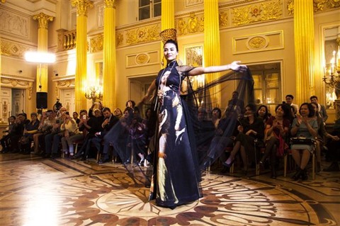 | Un "ao dài" en brocatelle présenté lors du défilé en Russie, le 20 octobre |