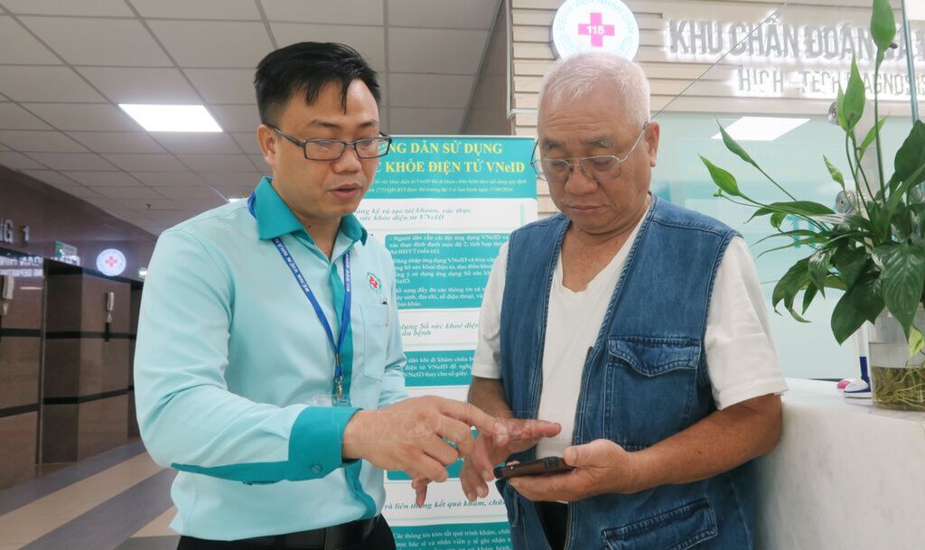 | Agent de santé de l'Hôpital du peuple 115 à Hô Chi Minh-Ville guidant un patient dans l'intégration de son Carnet de santé électronique sur l'application VNeID. |