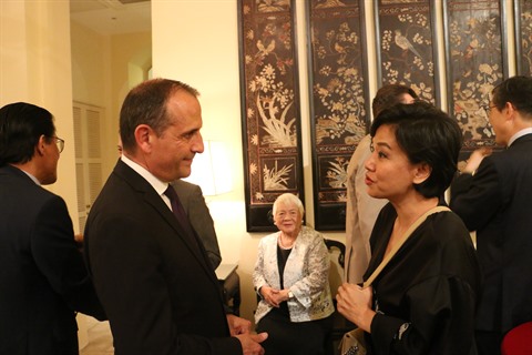 | Vincent Floreani, consul général de France à Hô Chi Minh-Ville, échange avec Mathilde Trân, gérante sénior en décoration intérieure, de la société Sonkimland. |