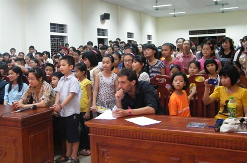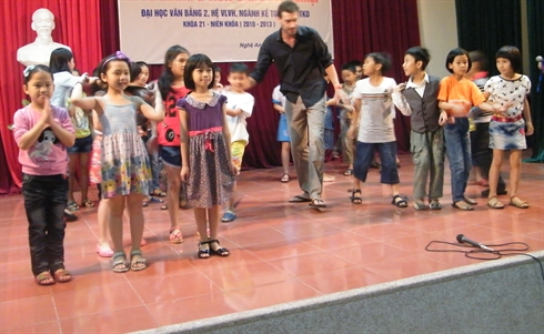 | Le comédien français Julien Renon et des élèves francophones des provinces de Nghê An et Hà Tinh (Centre). |