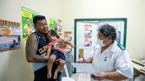 | Une infirmière parle avec un père de famille et sa fille dans une clinique d’Apia, le 4 décembre. |