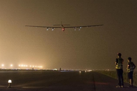 | Photo de Solar Impulse 2 décollant de l'aéroport international de Nankin, en Chine, le 31 mai, et publiée par les organisateurs du projet. |