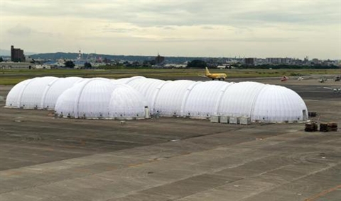 | Le hangar mobile qui protège Solar Impulse 2 sur l'aéroport de Nagoya, le 3 juin |