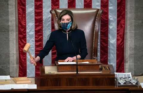 Comme pour mieux souligner la répétition historique, celle qui arbore d'ordinaire des ensembles aux couleurs vives avait opté pour la même tenue sombre, comme endeuillée, qu'au jour du premier "impeachment" de Donald Trump, le 18 décembre 2019.