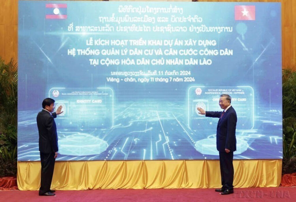 | Le président Tô Lâm (droite) et le secrétaire général et président du Laos Thongloun Sisoulith lancent le projet de construction d'un système de gestion de la population et d'identification des citoyens au Laos, à Vientiane le 11 juillet 2024. |