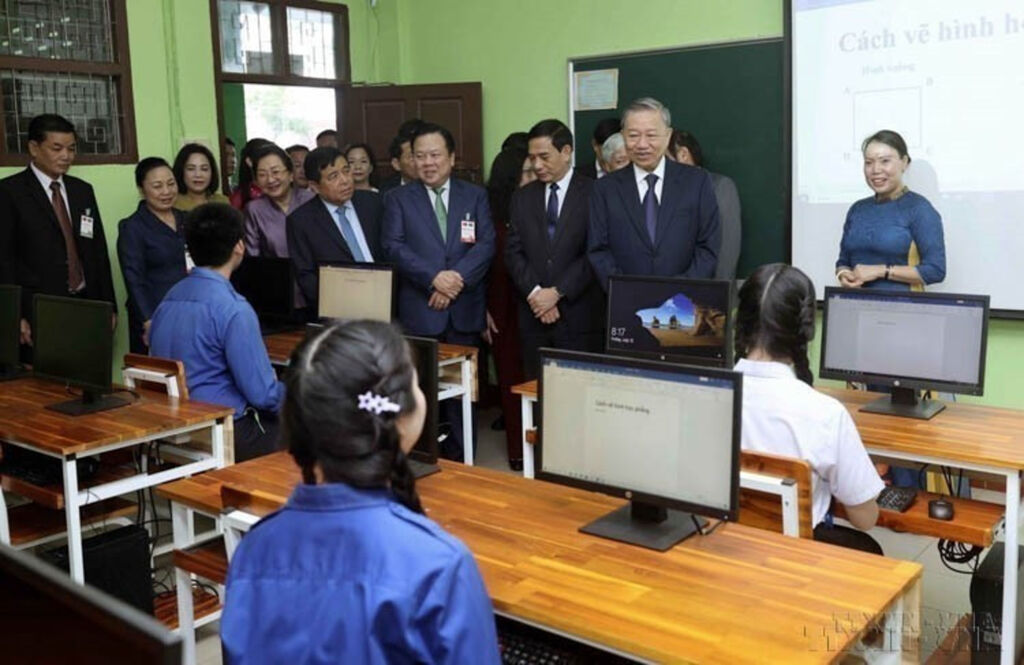 | Le président Tô Lâm visite la salle d'informatique de l'école bilingue lao-vietnamienne (école Nguyên Du) à Vientiane lors de sa visite d'État au Laos, le 12 juillet 2024. |