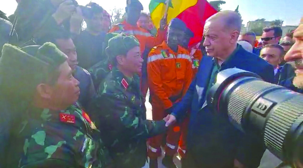 | Le président turc Recep Tayyip Erdogan (droite) exprime sa gratitude envers les forces vietnamiennes pour leur soutien opportun, le 20 février à Antakya. Photo : Hai Linh/VNA/CVN |