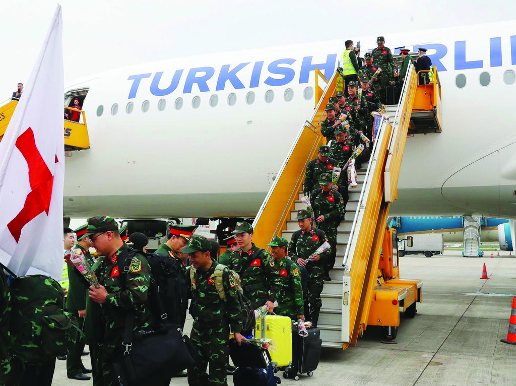 | Sa mission accomplie en Turquie, l’équipe de secouristes et de sauveteurs du ministère de la Défense est de retour à l’aéroport international de Nôi Bài, à Hanoï. Photo : Trong Duc/VNA/CVN |