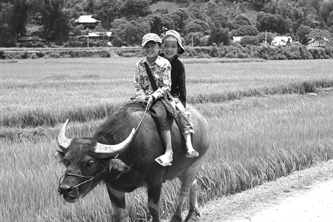 C'est justement cette qualité qui m'a conduit à une autre expérience bubaline. Je marchais dans un village, profitant d'une fin d'après-midi ensoleillée. Les bambous crissaient d'aise sous une légère brise de montagne. Les canards se regroupaient avant le retour au bercail. Les paysans cheminaient le dos courbé sous le poids de hottes surchargées. Dans ce tableau champêtre, il ne manquait plus que les buffles regagnant lentement leurs étables, sous la conduite de jeunes gardiens espiègles. Donc, pas de surprise, à ce qu'au coin du sentier apparaît un énorme buffle chevauché par un garçonnet d'une dizaine d'année. Comme je m'écarte pour laisser passer l'équipage, le titi des champs stoppe sa monture et m'adresse un claironnant «Hello !». Par politesse, je réponds par un sympathique «Chào cháu», en faisant bien attention à ma prononciation, pour éviter de dire «Chào trâu», ce qui reviendrait à saluer, non l'enfant, mais le buffle !