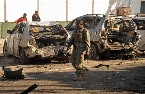 | Des voitures détruites après une attaque des rebelles islamistes shebab contre un restaurant du front de mer de Mogadiscio, le 22 janvier. |
