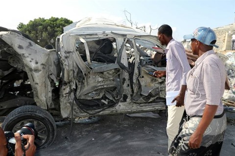| Des personnes à côté de l'épave d'une voiture sur le lieu d'une explosion à Mogadiscio le 15 juin. |